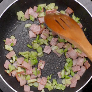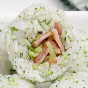 饭团馅料:锅烧热,倒入橄榄油,放入火腿片,煸出香味后,加入西兰花的根部,撒下盐和黑胡椒,翻炒均匀后就可以出锅啦。