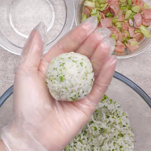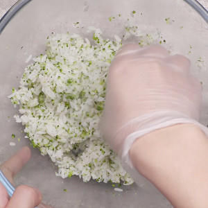 双手带上手套,手套上可以蘸一点水,这样在包饭团的过程中,就不会很粘。取一点饭团放到手心,压压扁,包入炒好的馅料,包成一个圆形就完成了。